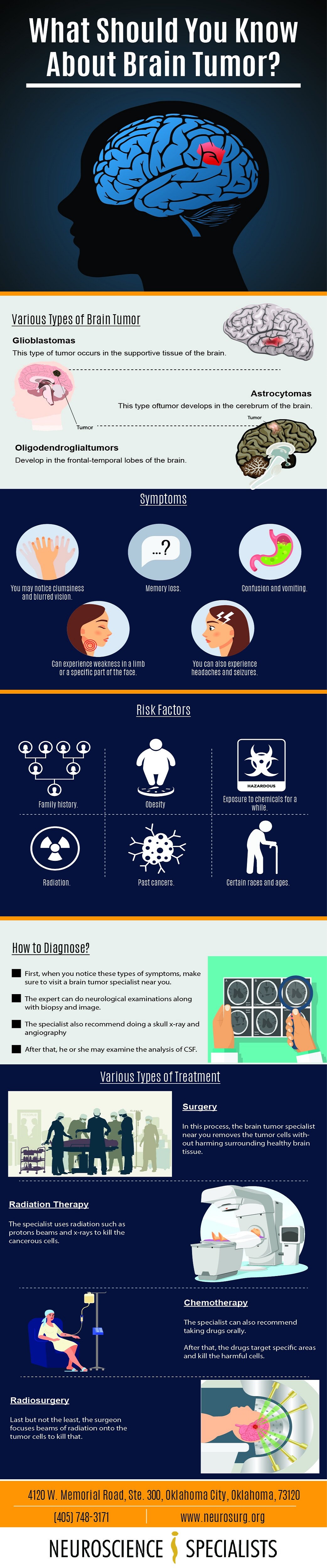 When abnormal cells grow in your brain rapidly, then it is called a brain tumor. There are three types of brain tumors that generally develop in the cerebrum, supportive tissue and frontal-temporal lobes of the brain. You can notice various symptoms including blurred vision, clumsiness, memory loss, headaches and seizures. But you don’t have to worry because there are various treatment plans available. The brain tumor specialist near you can recommend doing surgery, chemotherapy, radiation therapy and radiosurgery according to your situation.